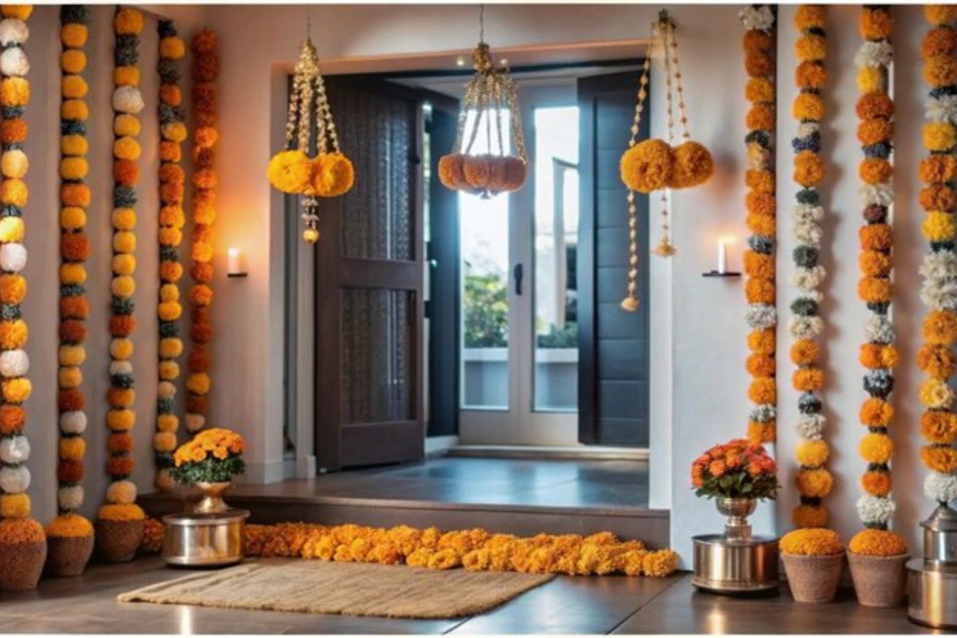Simple and divine decorations with pooja arrangements, torans, garlands, and welcoming setups.